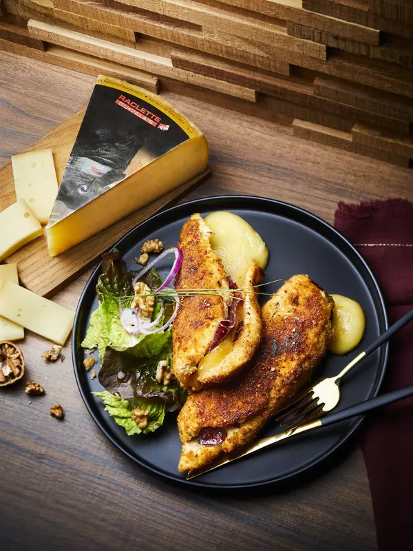 Une escalope de de poulet roulée autour de viande des Grisons et de Raclette du Valais AOP, puis panée... Un plat qui plait aux petits comme aux grands!