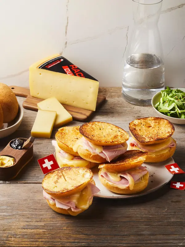 Garnissez les bases des brioches avec un peu de moutarde, déposez 1 tranche de jambon et 1 tranche de Raclette du Valais AOP. Refermez les croques avec leur chapeau.