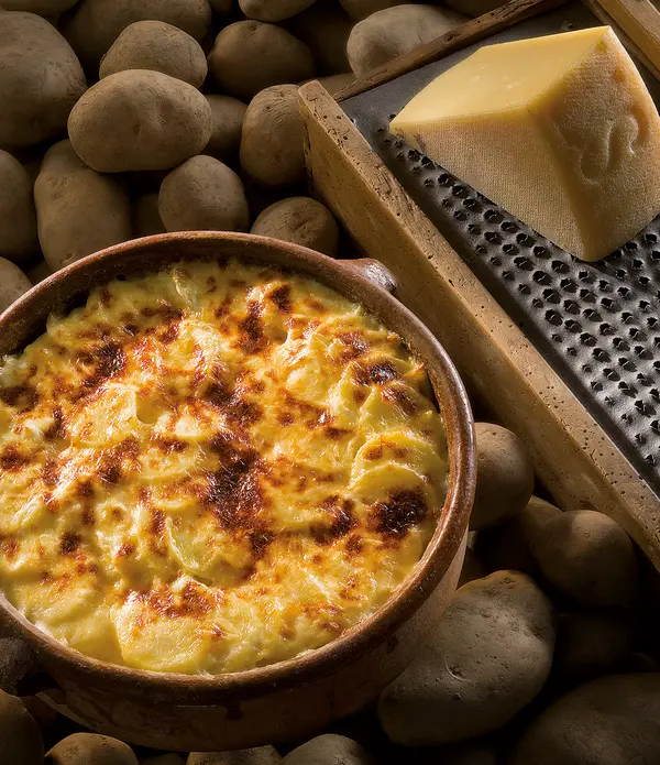 Disposer les pommes de terre dans un plat à gratin et les napper de béchamel. Répartir les tranches de Raclette du Valais AOP sur la sauce. Mettre à gratiner durant 15 à 20 minutes au milieu du four préchauffé à 220 °C.