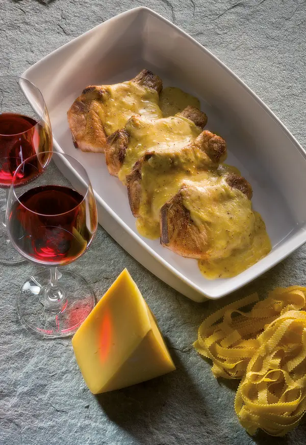 Koteletts in eine Gratinform legen & mit der Käse-Senfmasse bedecken.